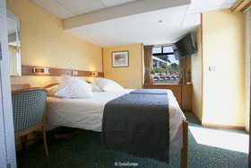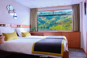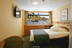 A: Dobbeltkahyt på øverste dæk med fransk balkon og store vinduer, der åbnes til siderne.